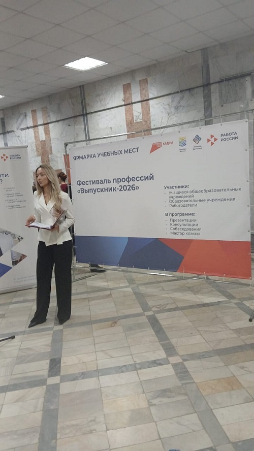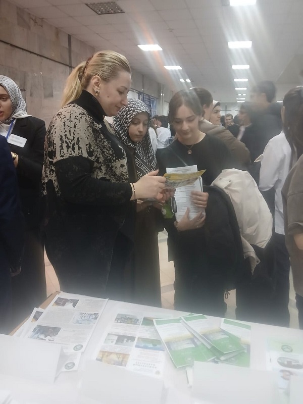 В целях обеспечения эффективной занятости молодежи из числа выпускников общеобразовательных и образовательных организаций, оказания им содействия в профессиональном самоопределении, реализации индивидуального потенциала и ориентировании их на выбор профессий (специальностей), пользующихся перспективным спросом на рынке труда, ГКУ РД ЦЗН в МО "город Махачкала" 18 декабря 2025 года проводилось мероприятие Фестиваль профессий "Выпускник - 2026" в здании Национальной библиотеки им. Р.Гамзатова. В мероприятии участвовали студенты и преподаватели Аграрно-экономического техникума. Заведующая производственным обучением техникума Гасанова И.П. ознакомила желающих с условиями поступления и специальностями техникума.