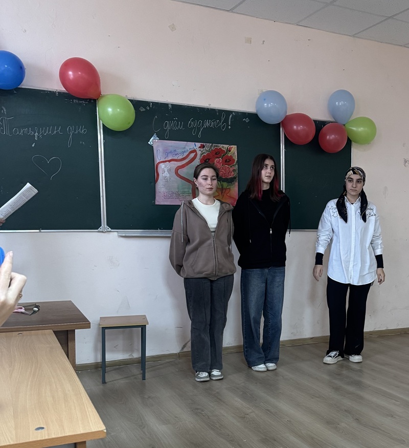 Наверное, нет в России студента, который бы не знал о существовании своего "профессионального" праздника - Дня студента, отмечаемого 25 января. Организаторами являлись кураторы Изиева И.Р. и Бариев Ю.А. участвовали студенты групп 2 Вет. А и 2 Вет Б. Мероприятие способствовало развитию творческой личности студентов, формированию художественных и партнерских качеств. В программе мероприятия были стихи, конкурсы, танцы, сценки. Присутствовали преподаватели техникума: Шабанова А.М., Рабданова З.К., Махматова М.З., Гаджимагомедова С.Г.